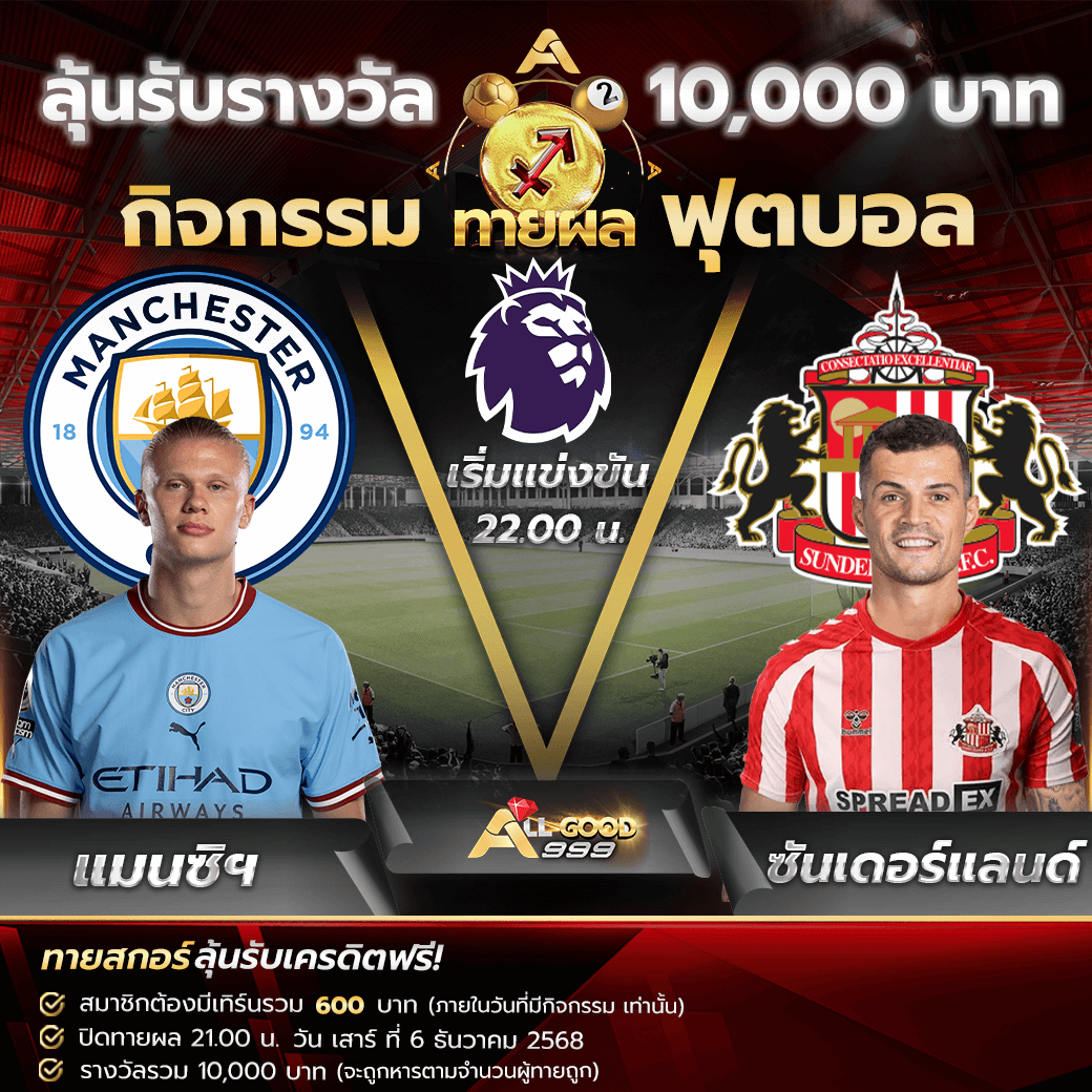 ทายผลบอล รอบวันที่ 06/12/68 ร่วมลุ้นสนุกทายผลสกอร์ของทั้ง 2 ทีม ทีมใดทำประตูแรก ทายถูกรับรางวัลรวม 10,000 บาท (หารตามจำน